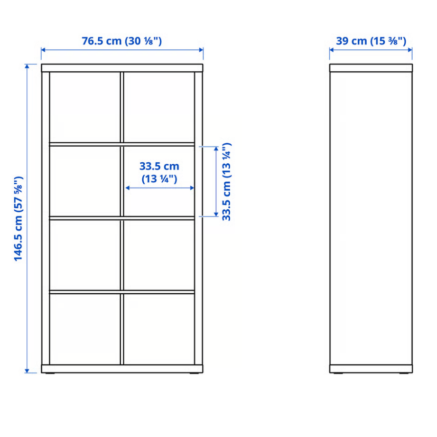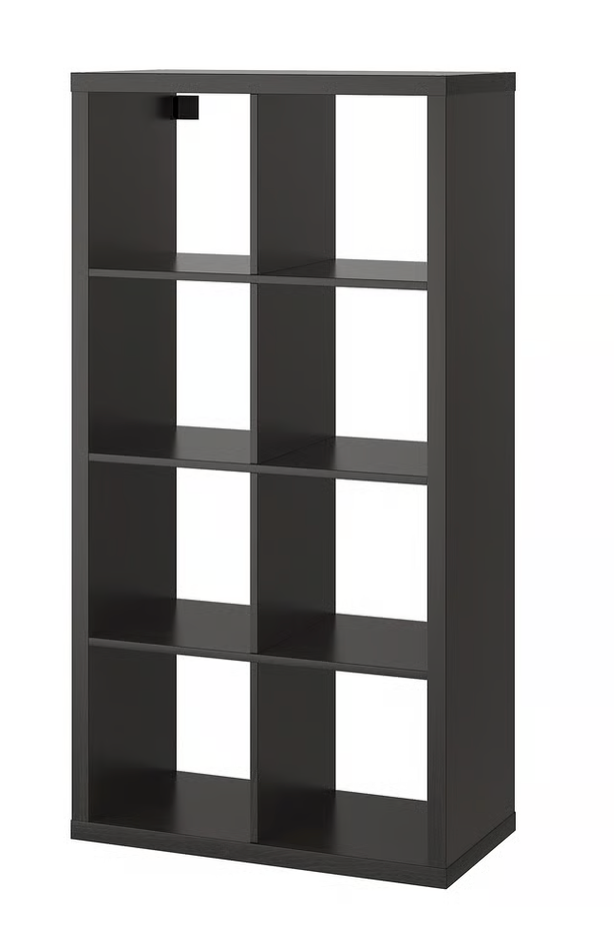Bookshelf with 8 cubes. Primarily used for our children's books selection. 3 years old with typical wear and tear (i.e some scratches). Bottom has some cosmetic imperfections that aren't visible if displayed horizontally (we drilled holes to install castors and removed them). Model is KALLAX from IKEA. Measurements attached.