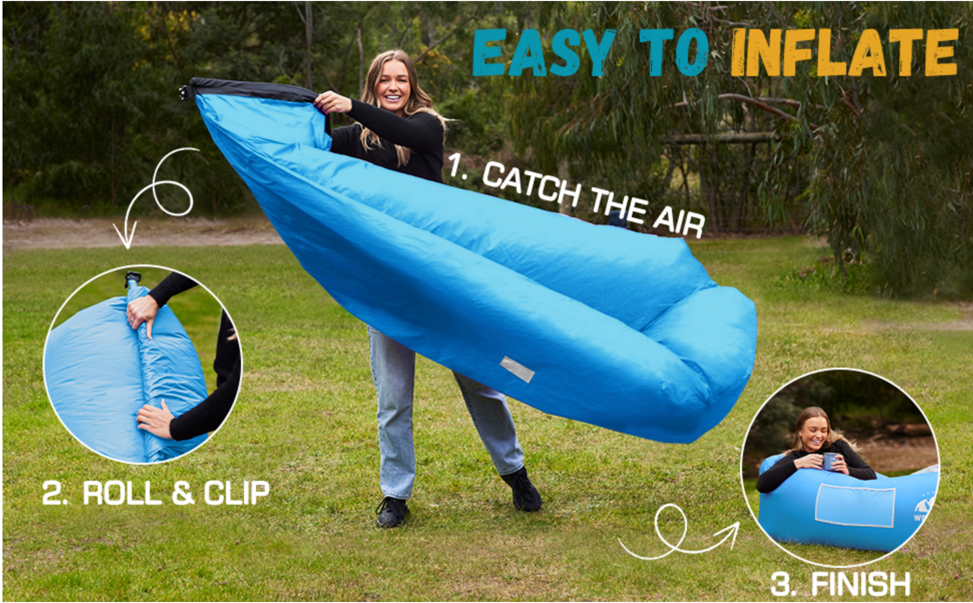 Bundle of 6 Inflatable Lounger Chairs. Colors include Pink, Blue, Green, Black, Purple, and Orange. 3 years old in brand new condition. Used less than 3 times for events held in courtyard in previous years. Compact storage and perfect for beach/park. Measurements and specs pictured.